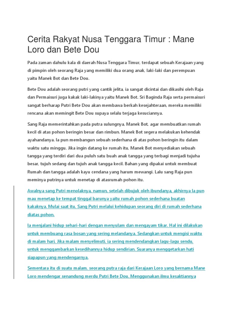Cerita rakyat nusa tenggara timur bete dou. Ia sangat disayangi oleh kedua orang tua dan kakak laki lakinya yang bernama manek bot. Mane loro dan bete dou. Cerita rakyat ntt bete dou no mane loro bete dou adalah seorang putri raja yang cantik jelita dari kerajaan wefulan di daerah nusa tenggara timur indonesia.