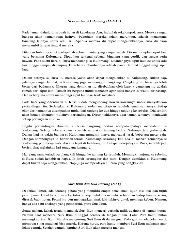 Home cerita binatang dongeng fabel si rusa dan si kulomang si rusa dan si kulomang written by unknown on saturday 15 november 2014 2234. Namun karena kelebihan itu mereka menjadi hewan yang sombong dan serakah. Berdasarkan pengertian dan ciri ciri tersebut dongeng si rusa dan si kulomang 3 yang berasal dari kepulauan aru maluku dapat dikategorikan sebagai sebagai fable yang diwariskan secara lisan dan anonim.