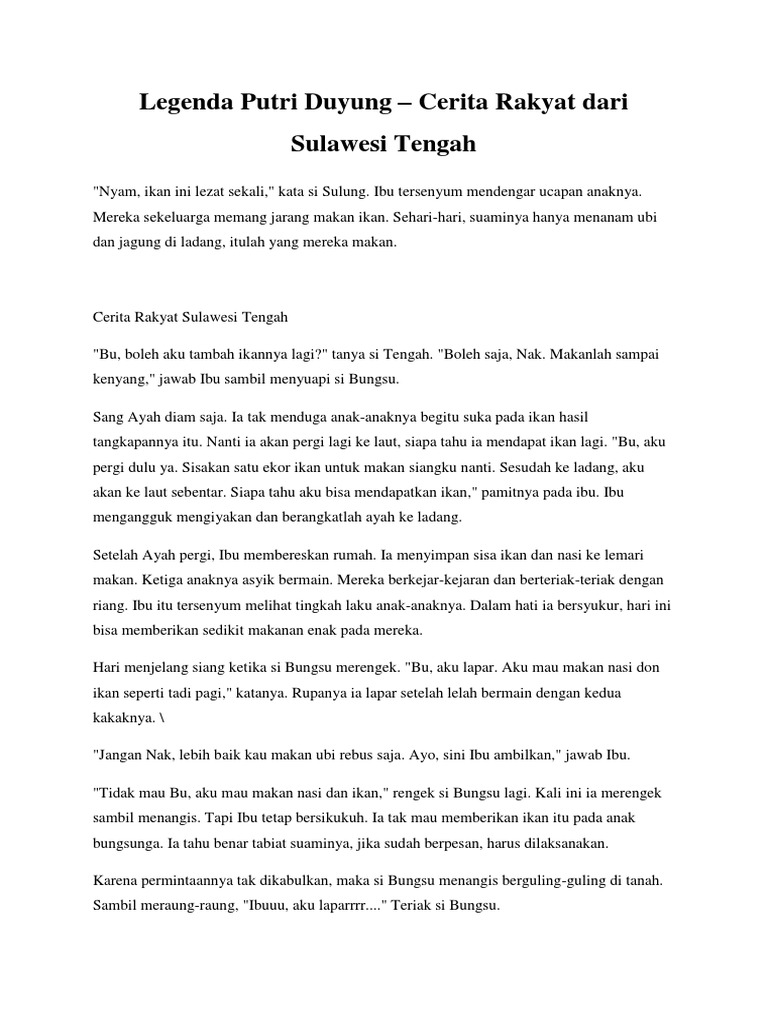 Legenda putri duyung cerita rakyat sulawesi tengah di sebuah kampung di daerah sulawesi tengah hiduplah sepasang suami istri bersama tiga orang anaknya. Penyesalan seorang ibu pada cerita rakyat sulawesi tengah. Amanat moral dari cerita ini adalah kita harus berhati hati dalam mengambil keputusan serta selalu menjaga amanah yang dipercayakan pada kita.