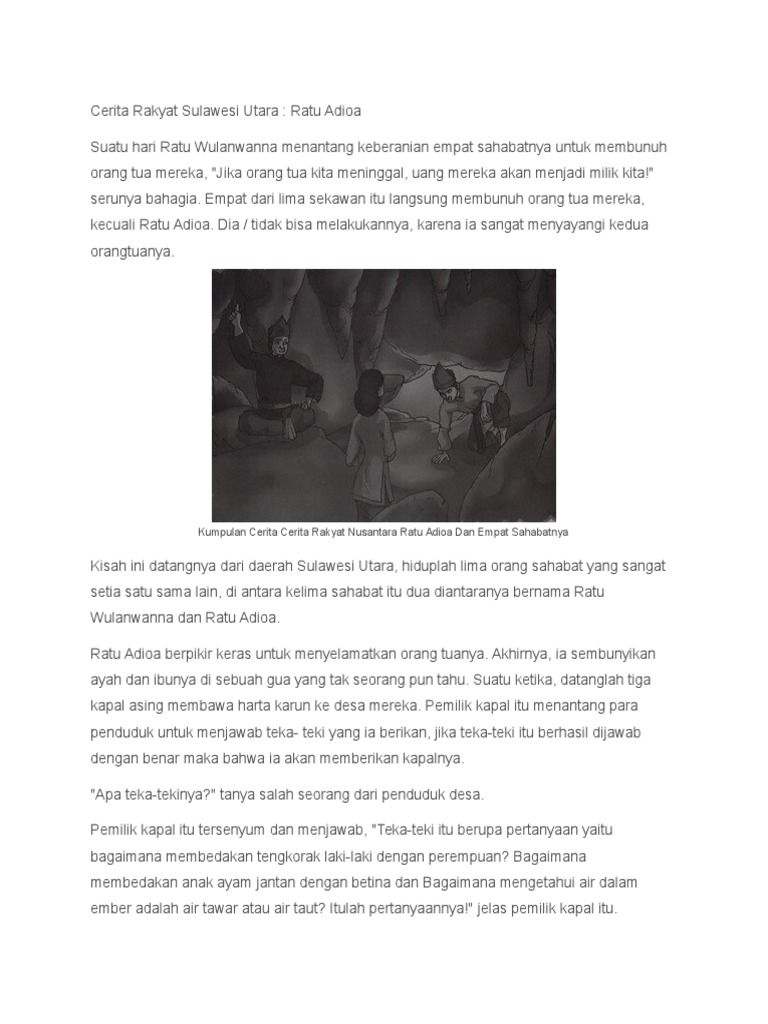Cerita rakyat sulawesi utara. Ratu adioa suatu hari ratu wulanwanna menantang keberanian empat sahabatnya untuk membunuh orang tua mereka jika orang tua kita meninggal uang mereka akan menjadi milik kita serunya bahagia. Ratu adioa suatu hari ratu wulanwanna menantang keberanian empat sahabatnya untuk membunuh orang tua mereka jika orang tua kita meninggal uang mereka akan menjadi milik kita serunya bahagia.