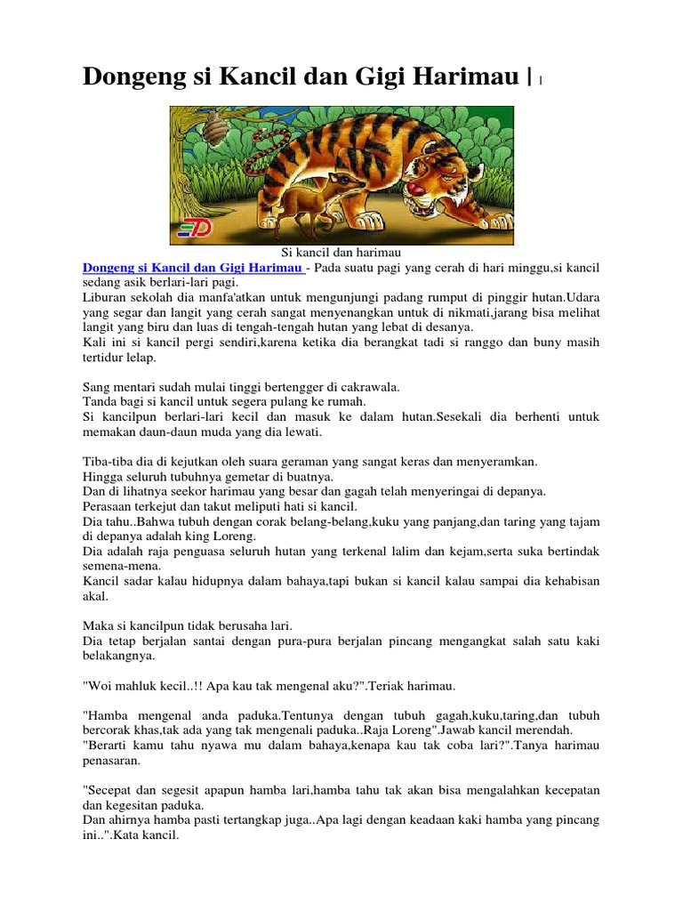 Dongeng cerita kancil dan harimau. Dongeng si kancil dan gigi harimau pada suatu pagi yang cerah di hari minggusi kancil sedang asik berlari lari pagi. Kancil sangat ditakuti dan disegani di hutan ini oleh seluruh binatang. Nah adik adik yuk kita baca saja dongeng nya.