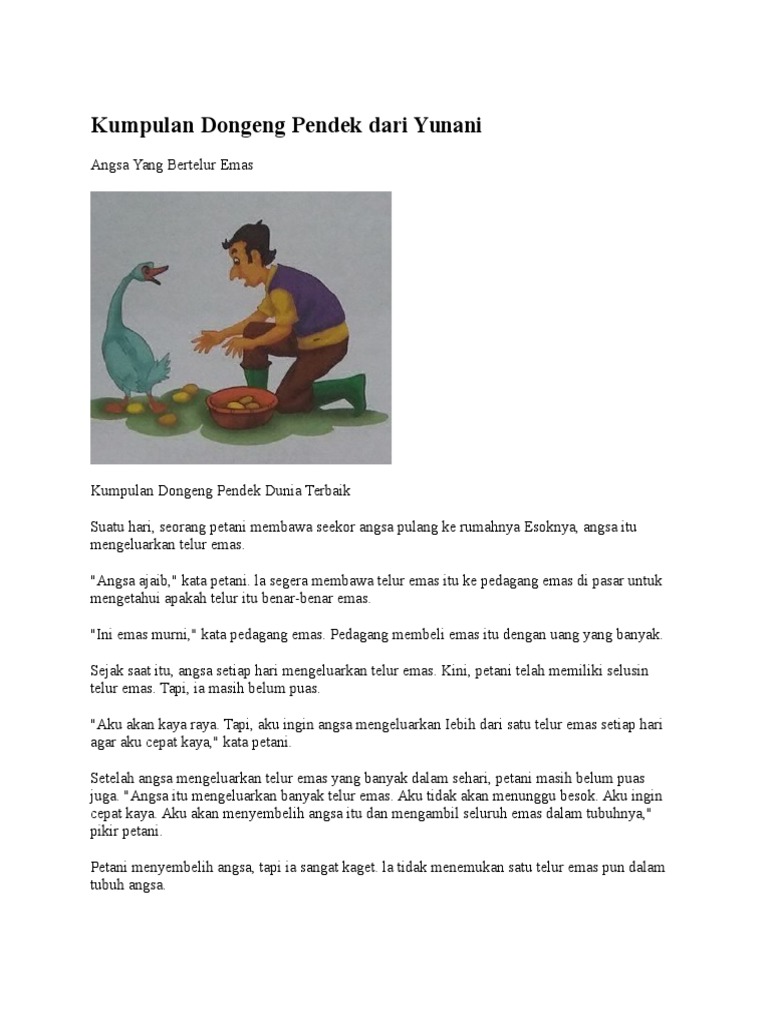 Angsa yang bertelur emas. Berikut ini adalah kumpulan dongeng untuk anak anak yang baik untuk dibacakan sebelum tidur.