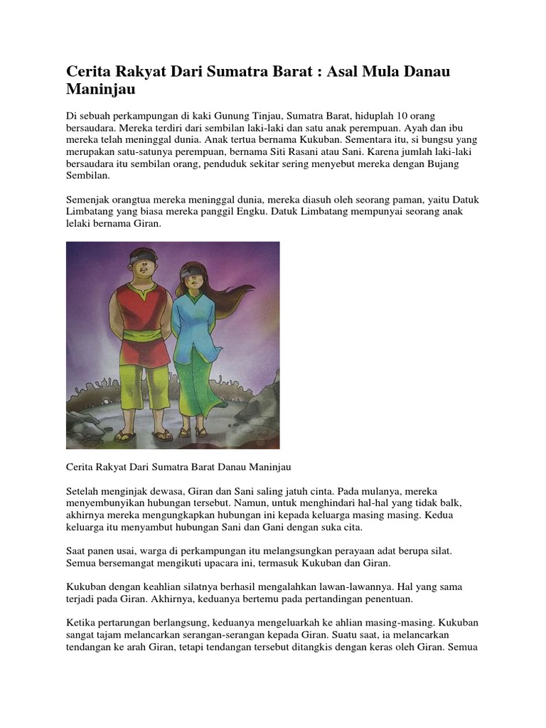 Cerita rakyat dari sumatra barat legenda danau maninjau. Konon letusan gunung tinjau itu menyisakan kawah yang luas dan lama kelamaan berubah menjadi danau. Pesan moral dari cerita malin kundang singkat indonesia adalah surga ada di bawah telapak kaki ibu. Cerita rakyat dari sumatra barat yang kakak posting malam hari ini masih berkisah mengenai asal mula nama daerah di sumatera barat.