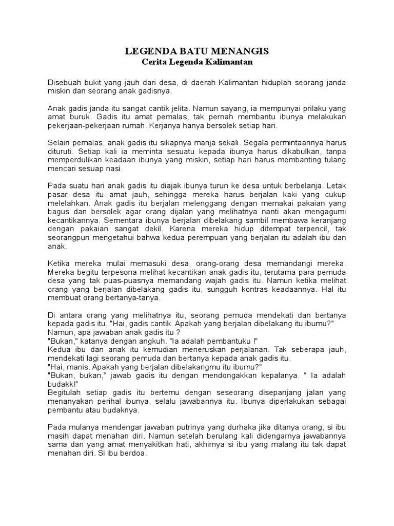 Cerita rakyat asli kalimantan barat. Cerita legenda batu menangis ini cerita yang berasal dari kalimantan dimana seorang anak dikutuk ibunya menjadi sebuah batu dalam cerita legenda batu menangis ini banyak tersimpan sebuah makna dan pelajaran yakni kita harus berbakti kepada kedua orang tua terutama pada seorang ibu yang telah melahirkan kita selama 9 bulan okelah kaloo begitu kita baca saja cerita legenda batu menangis. Batu menangis di sebuah desa terpencil tinggallah seorang gadis dan ibunya.